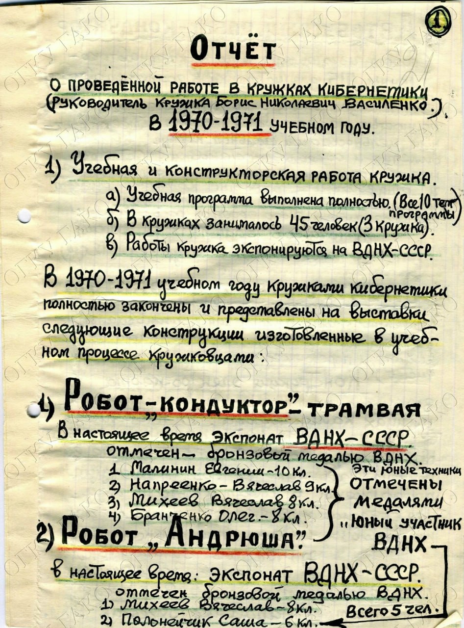 Над чудо-машиной трудились школьники Женя Малинин, Слава Напреенко, Олег Бранченко и Слава Михеев под руководством Бориса Николаевича Василенко. Их разработка даже получила большую бронзовую медаль на ВДНХ — уровень, как говорится, федеральный.
