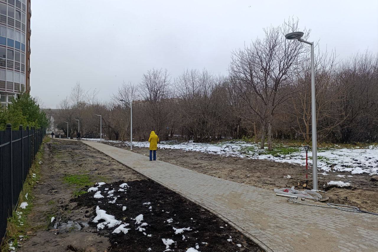 На объекте уже уложили почти всю плитку. Рабочие завершают небольшой кусок тротуара со стороны улицы Невского. Также вдоль дорожки установили фонари.