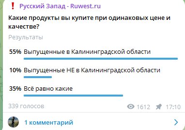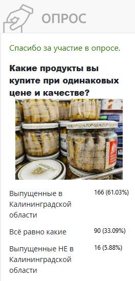 Согласно опросу «Русского Запада», для большей части граждан – ещё какое! 58% респондентов выберут выпущенные в янтарном крае продукты питания при одинаковых цене и качестве и предпочтут их импортируемой или завозимой из других регионов России продукции.
