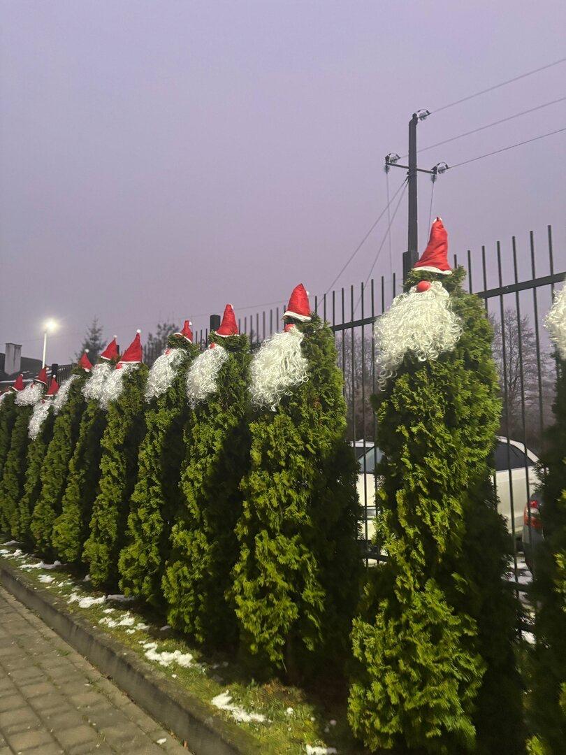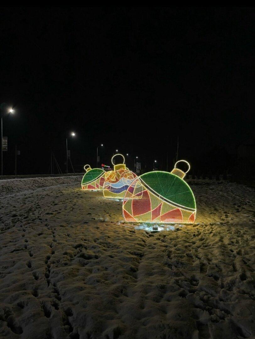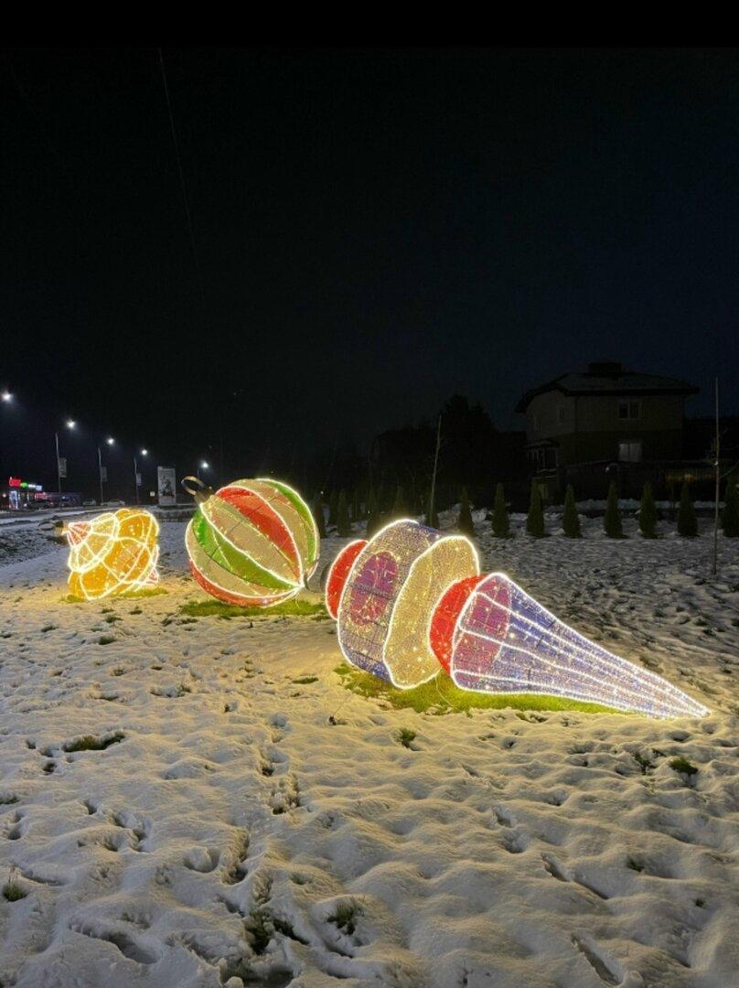 По обочинам будто кто-то разбросал огромные ёлочные игрушки. Нарядно выглядит и площадь рядом с храмом и администрацией. А в одном из детских садов вечнозелёные туи превратили в весёлых гномиков.