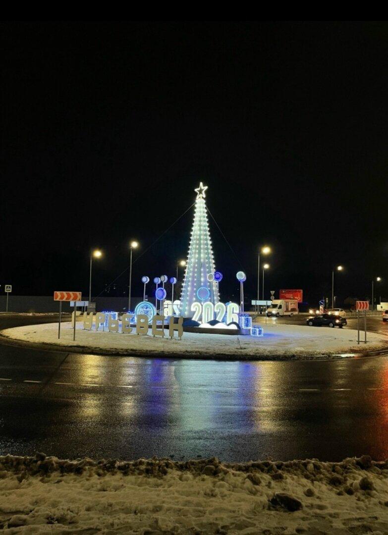 На разворотном кольце стоит ёлка и световые фигуры.