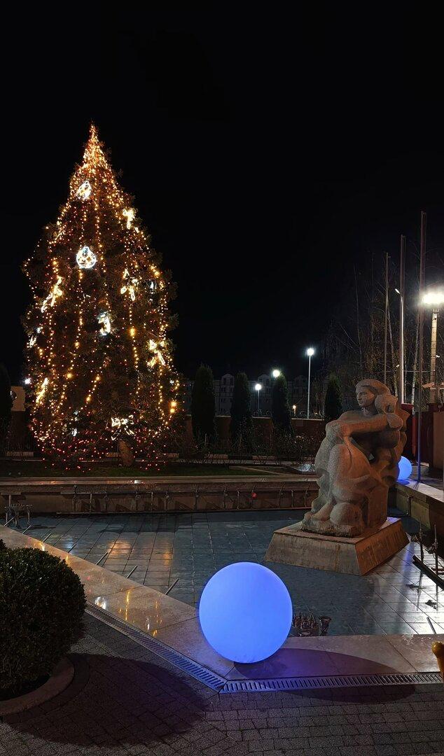 Сейчас занимаются украшением парка. Праздничные шары вешают на беседку, гирляндами украшают деревья.