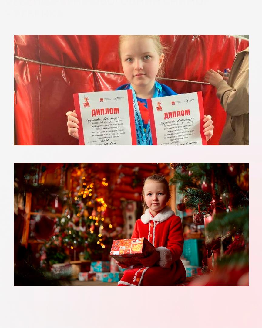 «Используй загруженную фотографию ребёнка в качестве основного объекта. Портрет в полный рост, ребёнок сидит рядом с украшенной новогодней ёлкой, одет в красное праздничное платье с белой меховой отделкой, держит в руках подарочную коробку с блестящей обёрткой, глаза широко раскрыты от восторга, мягкий тёплый свет гирлянд отражается на лице, уютная праздничная атмосфера, фотореалистичный стиль, малая глубина резкости, чёткий фокус на ребёнке».