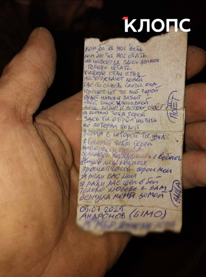 «Мне известно, что Грант погиб на боевом задании. Недавно мне удалось поговорить по телефону с одним из его сослуживцев. Тот спросил: «А ты из Калининграда? Тут с нами был парень, он тоже погиб. У нас нет контактов его семьи — они были у Гранта. Этот парень написал последнее стихотворение для своих близких. Надо, чтобы жена почитала. Можешь разместить у вас в местных группах?» Он прислал фотографию небольшого листка бумаги, где написаны эти тяжёлые строки. Стихи подписаны фамилией Андронов, стоит дата — 25 июля 2025 года», — рассказывает Сузанна.