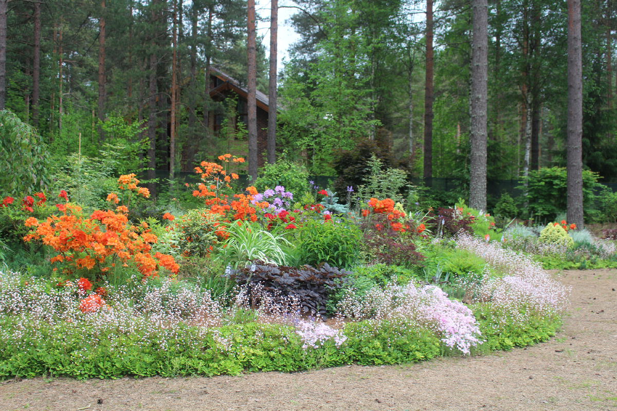 В начале июня сад наполняется цветами рододендронов и прочих растений, создавая идиллический вид. К этому времени особенно стоит обратить внимание на флокс метельчатый "Гений", который уже побрел в цвет. Но в августе его цветение подходит к концу, и его заменяют листья, которые становятся основным акцентом в саду. Например, клен ясенелистный "Flamingo" освежает композицию своими яркими листьями, которые начинают проявлять себя только с середины лета.