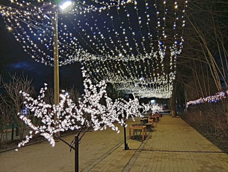 Туристов на Крымский переулок заманивают светящимися растениями. Разумеется, цветы искусственные. Однако, выполнены бутоны настолько тонко, что отличить их от настоящих можно только вблизи. Сакуры начинают светиться, как только у моря сгущаются сумерки. Эффект праздника усиливает полог, который зажигается над головой синхронно с сакурами. Власти Зеленоградска назвали это место точкой признаний в любви.