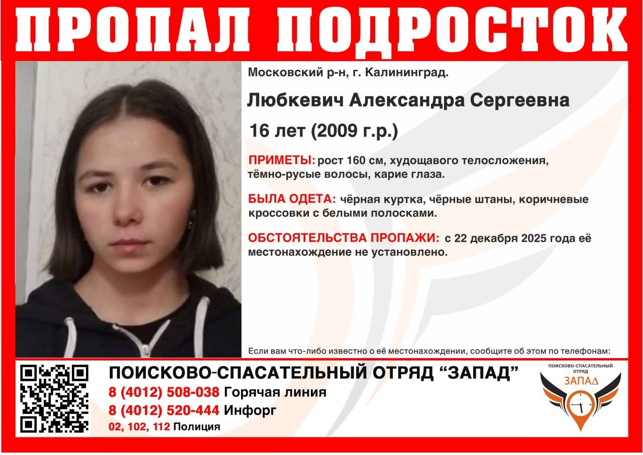 В Калининграде ищут 16-летнюю Александру Любкевич. Об этом сообщает ПСО «Запад».