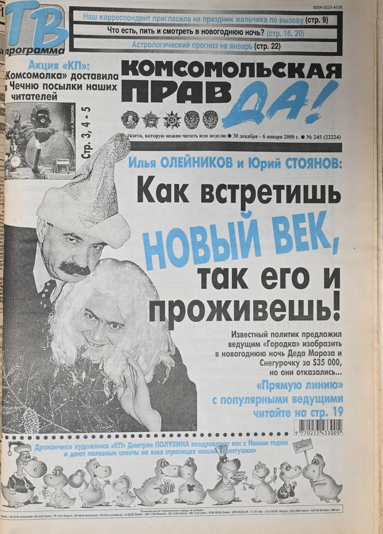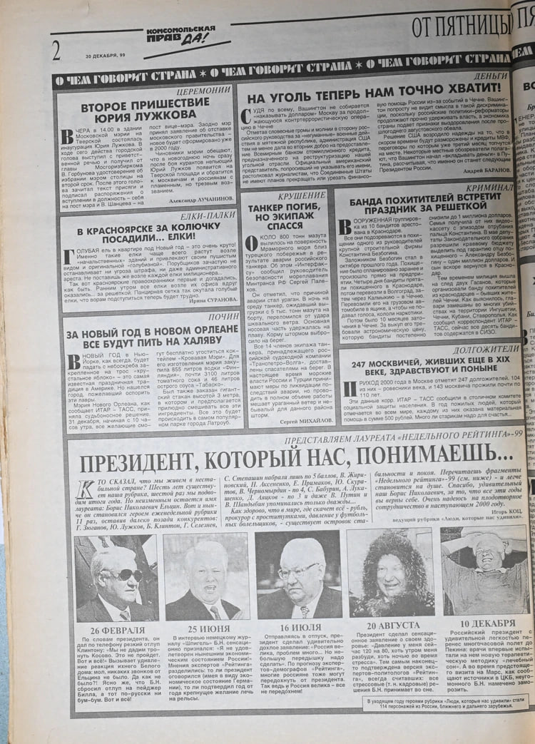 Праздник возвращается — шумный, глянцевый, с советами, гороскопами и телепрограммами. Газета подводит итоги года. Всё снова ярко и шумно: гороскопы, советы, ТВ-программа. В рейтинге удививших — Борис Ельцин. И уже на следующий день он удивляет по-настоящему, уходя в отставку.