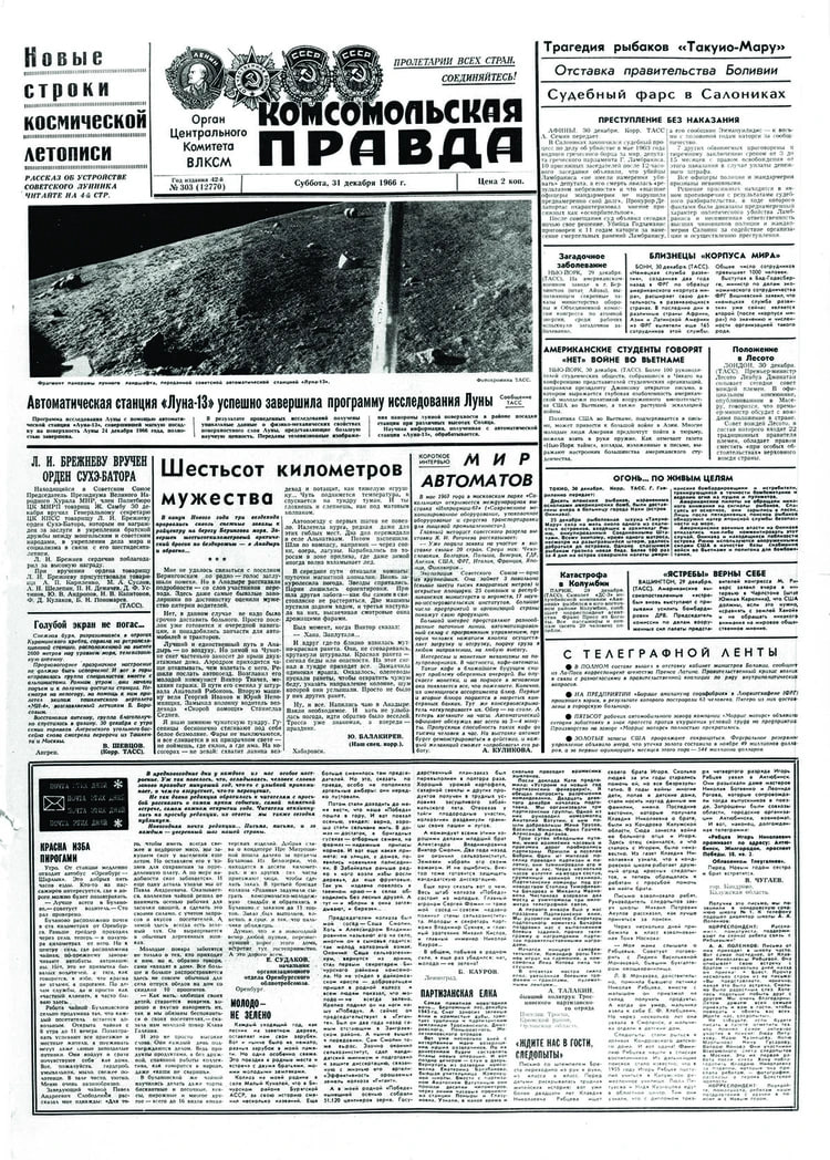 Время космоса. Газета встречает Новый год без сантиментов — на первых полосах «Луна-13», научные данные и телесигналы с поверхности спутника. Праздник где-то между строк: стране важнее покорение Вселенной.
