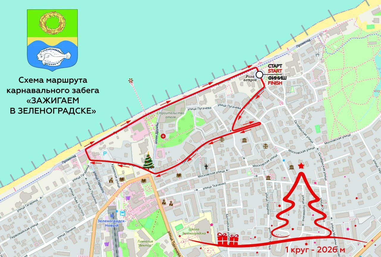 Более 60 Дедов Морозов и других сказочных персонажей пробегут 2026 метров по Зеленоградску в новогоднем костюмированным карнавальном забеге.