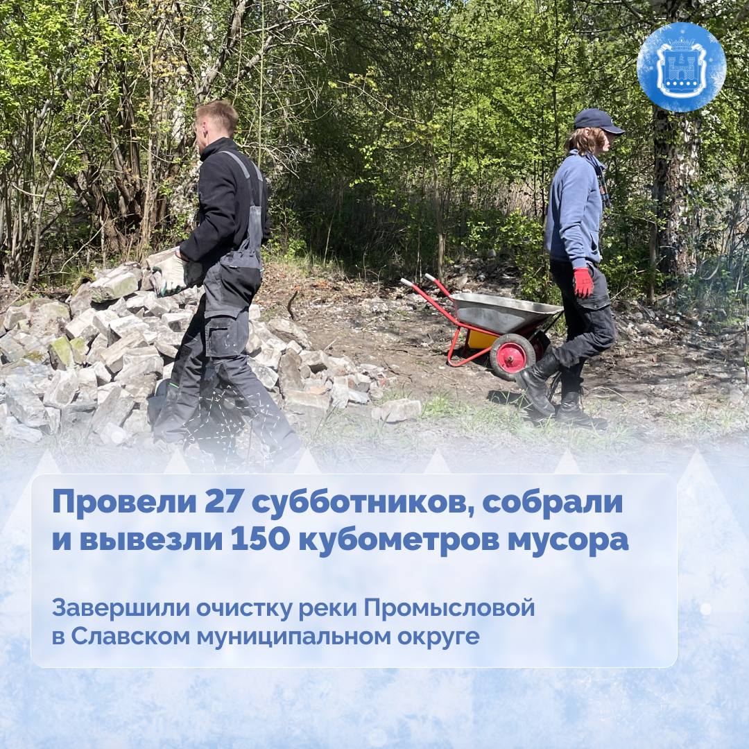 Завершили очистку реки Промысловой в Славском муниципальном округе, провели субботники и собрали тонны мусора.