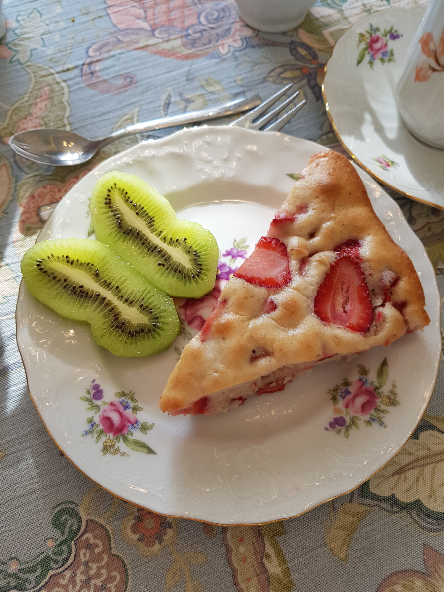 После того как пирог готов, его стоит дать немного остыть. Для завершения подачи очищенные киви нарезать кусочками и украсить ими десерт, сформировав, например, изображение бабочки. Такой яркий и сочный пирог станет отличным дополнением к утреннему чаепитию или десерту на любом летнем празднике. Приятного аппетита!