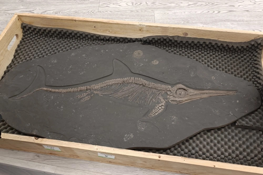 Древняя рептилия попала в российский эксклав в виде отпечатка на камне. По словам калининградских ученых, такого идеально сохранившегося скелета ихтиозавра нет больше ни в одном другом музее страны.