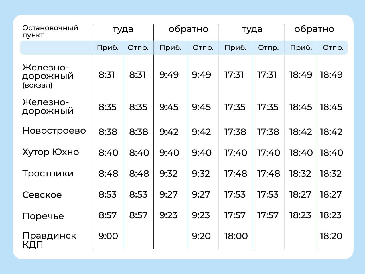 От Железнодорожного автобус пойдет через поселки: Новостроево, Хутор Юхно, Тростники, Севское, Поречье и в Правдинск.