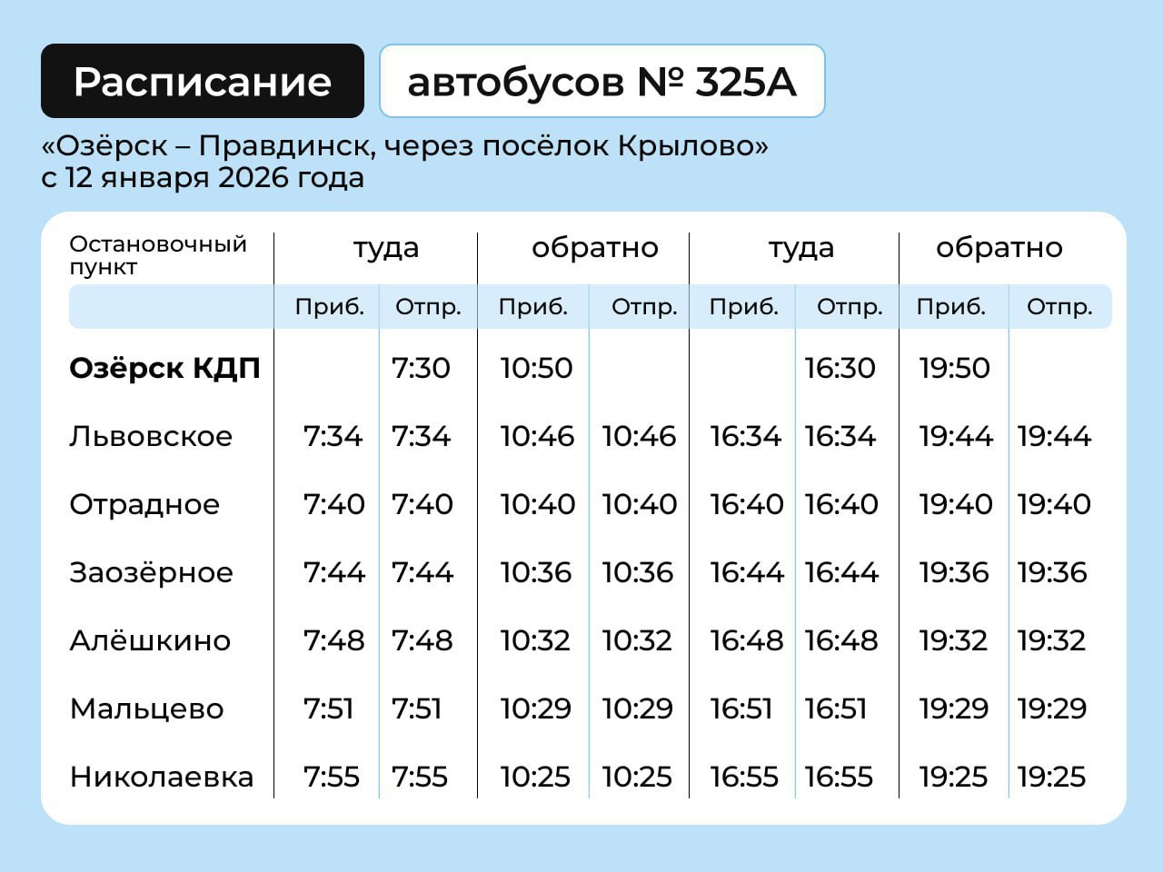 С 12 января изменяется маршрут движения автобуса №325А, который раньше ходил из Озерска через Крылово до посёлка Железнодорожный. Теперь этот маршрут продлён дальше – до Правдинска.
