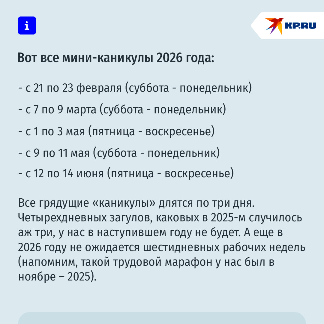 В 2026 году почти все праздники удачно выпадают на начало или конец недели и автоматически удлиняют выходные. Исключение — только День народного единства 4 ноября: он приходится на среду. Просто один выходной посреди недели — и дальше снова на работу.