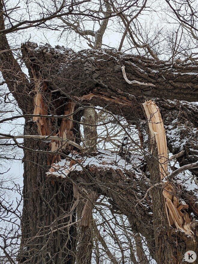 Огромное дерево, толщина ствола которого достигала два-три обхвата, повалило штормом, разыгравшимся в канун Нового года. Оно обломилось на высоте около трёх метров от земли и рухнуло, сломав ещё и соседа.