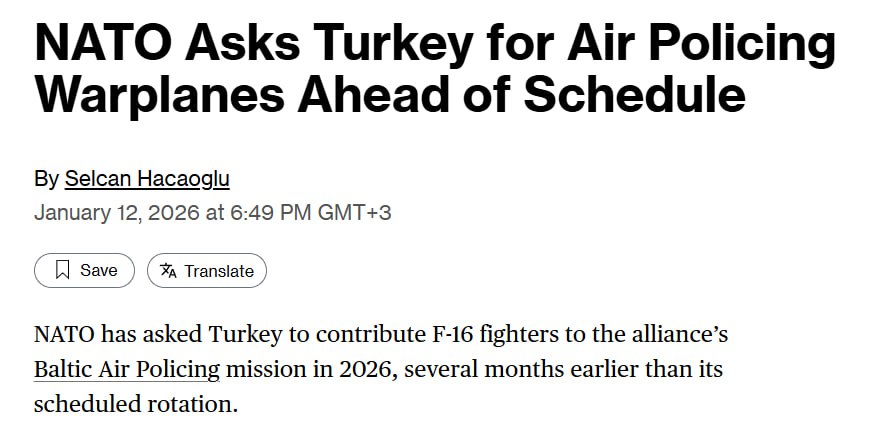 «Предлагаемая четырёхмесячная ротация в Эстонии с августа по декабрь происходит на фоне усиления обороны НАТО после нарушений воздушного пространства Россией, сообщили источники, знакомые с ситуацией. Турция уже планировала развернуть военные самолёты в Румынии с декабря 2026 по март 2027 года, сообщили они.Анкара пока не решила, как она отреагирует на запрос НАТО. Турецкие истребители последний раз патрулировали в рамках миссии в начале 2025 года, сообщили люди, которые пожелали остаться анонимными из-за чувствительности ситуации. <...>