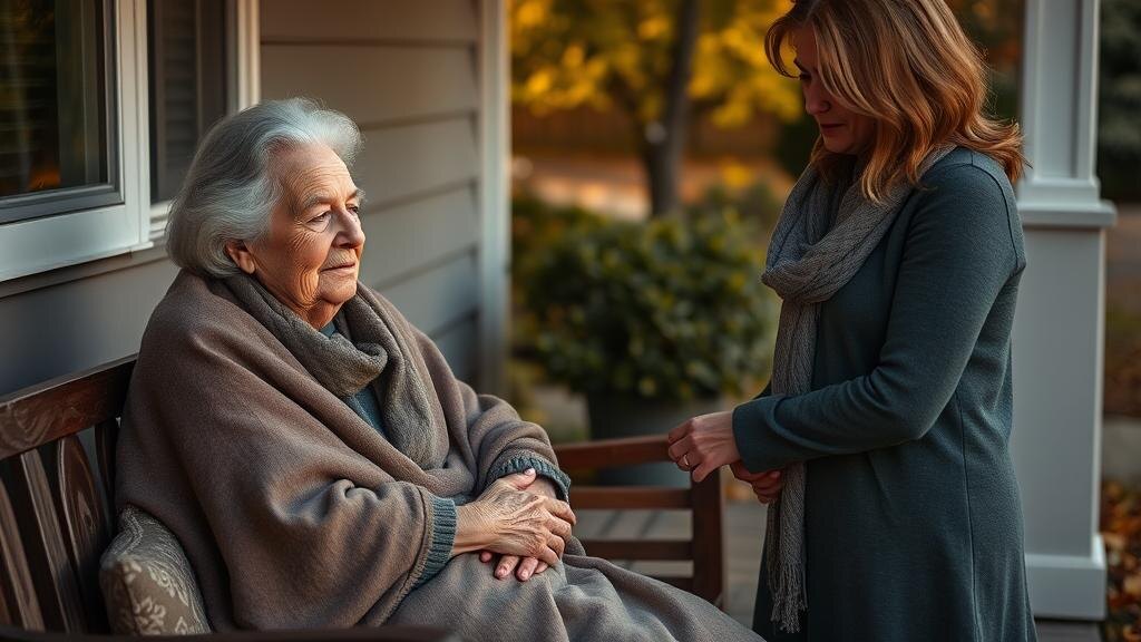 После сытного завтрака и уборки, Марина заботится о том, чтобы мама могла умыться. Влажная салфетка остаётся теплой в руках дочери, несмотря на невыносимую чувствительность её мамы. В этот момент Марина нежно задаёт вопрос: "Может, выйдем на улицу после обеда?" Материнский ответ осторожен: "Если дождя не будет…" Эта осторожность стала привычкой — с каждым разом мама аккуратно оставляет себе возможность для выбора.
