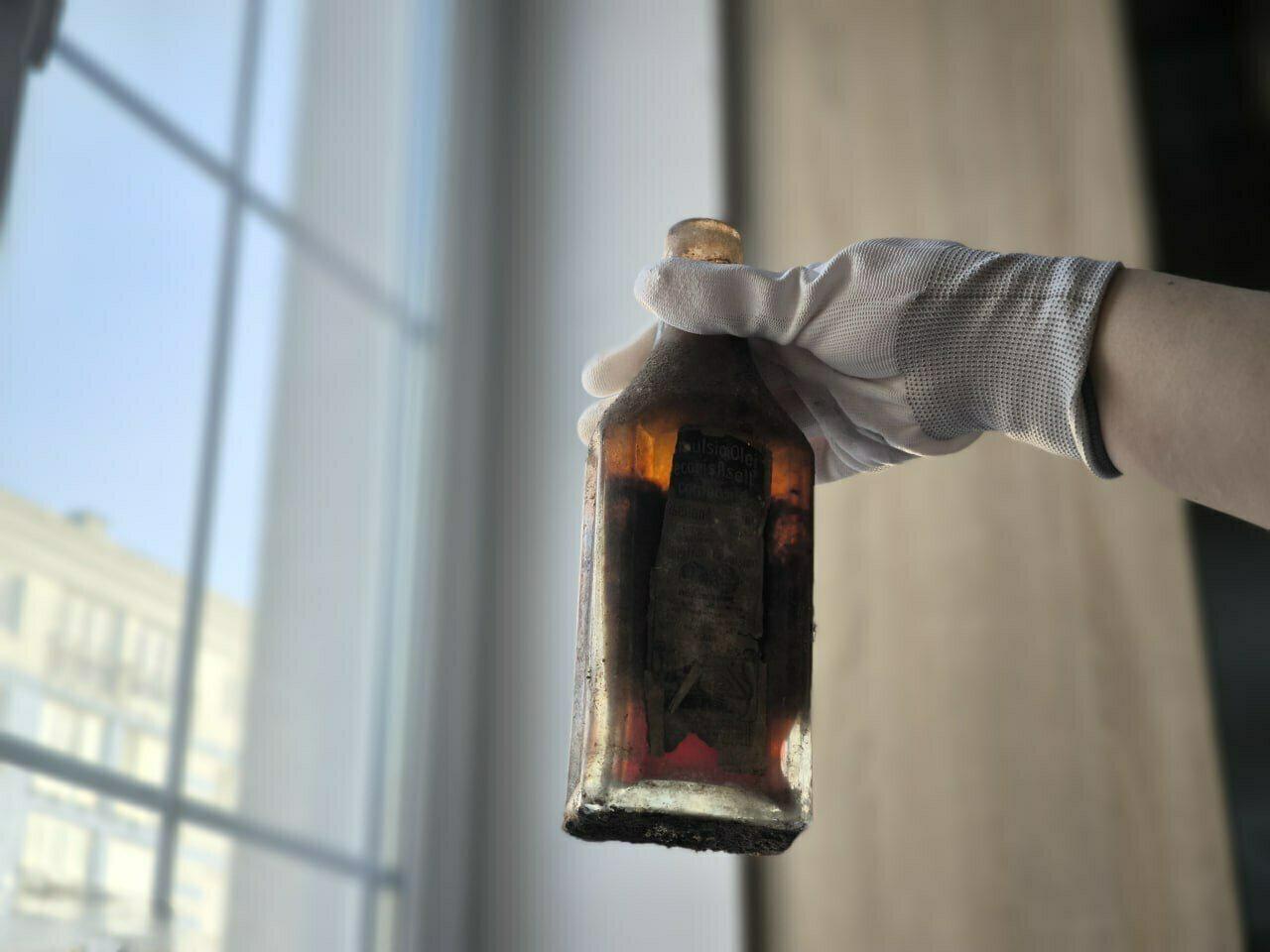 На двух бутылках сохранились оригинальные этикетки, внутри — содержимое. По словам сотрудников музея, на этикетках удаётся разобрать фрагменты текста.