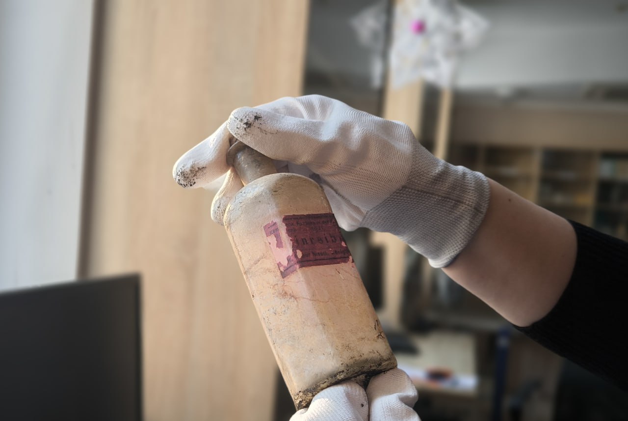 Работы на памятнике архитектуры XIX века ведутся с июля 2025 года. При разборе одного из заложенных каминов нашли три ёмкости, на двух из них сохранились оригинальные этикетки.