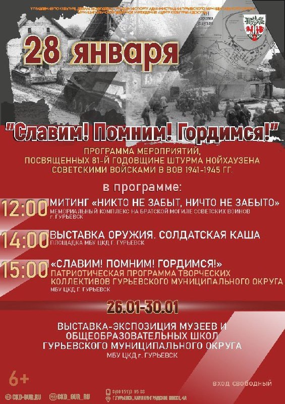 Жителей и гостей Гурьевска приглашают стать участниками патриотической программы «Славим! Помним! Гордимся!», посвящённой 81-й годовщине взятия Нойхаузена советскими войсками в Великой Отечественной войне 1941-1945 гг.