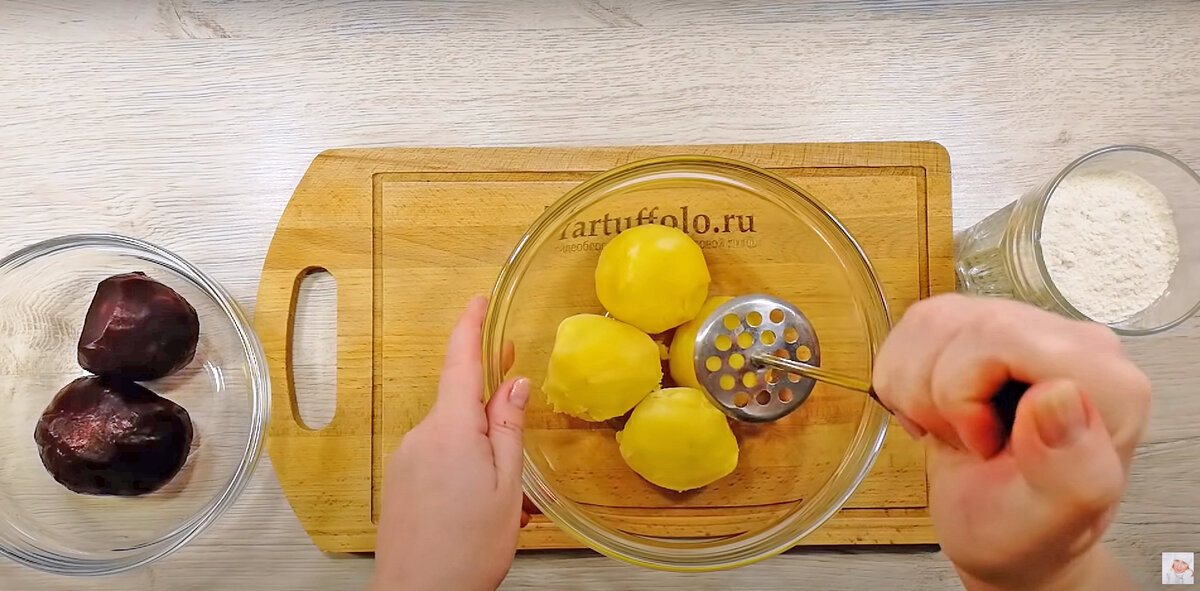 Первым шагом следует отварить картофель и свеклу, желательно заранее, чтобы они успели остыть. Пюрируйте картошку до получения однородной массы с помощью толкушки — можно также воспользоваться мелкой теркой. Свеклу, в свою очередь, натрите на мелкой терке (удобнее делать это в дуршлаге, чтобы избавиться от излишней влаги).