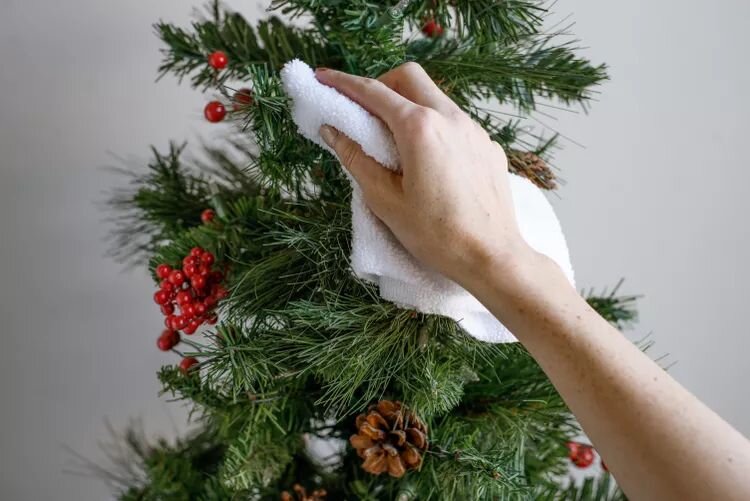 - Протирайте ветки влажной тряпочкой, двигаясь от верхушки к основанию дерева.