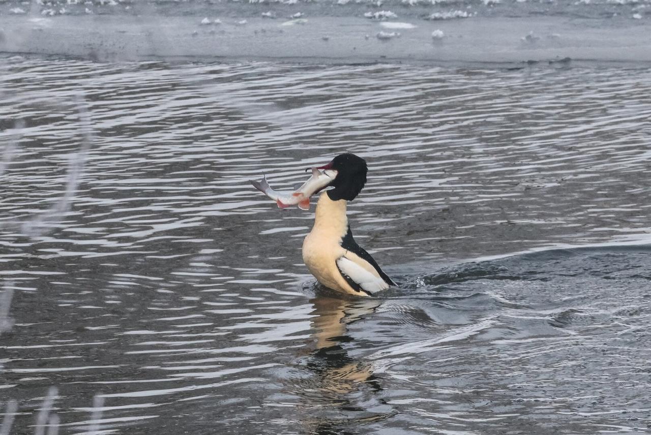 Свидетелем охоты (или рыбалки?) Юрий случайно, проезжая на машине по берегу реки. Несколько крохалей выхватывали из воды и жадно заглатывали крупных рыбин. Иной раз добыча была так велика, что даже не помещалась в клюве!