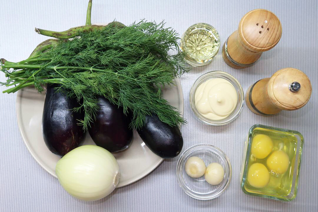 В ту же сковороду добавить оставшееся масло и жарить баклажаны до румяной корочки, аккуратно переворачивая их. Когда они будут готовы, добавить обжаренный лук, укроп, чеснок, соль и перец, тщательно перемешать, и в заключение добавить майонез перед подачей на стол.
