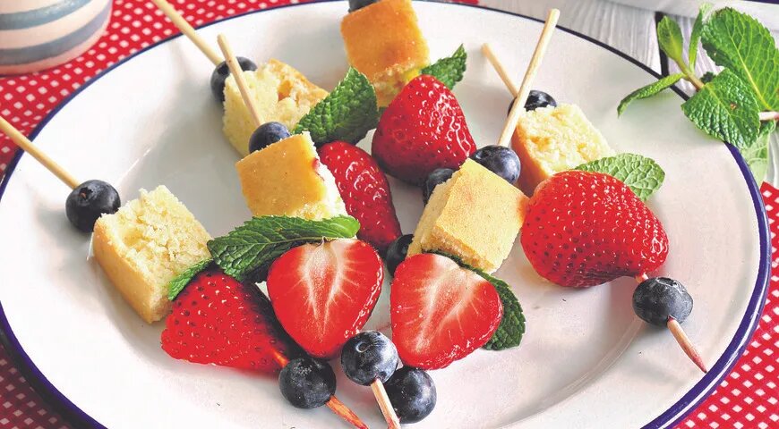 - Ягодные канапе с лимонным бисквитом: простые в приготовлении и яркие в подаче. К вам сразу потянутся не только именинник, но и его гости.