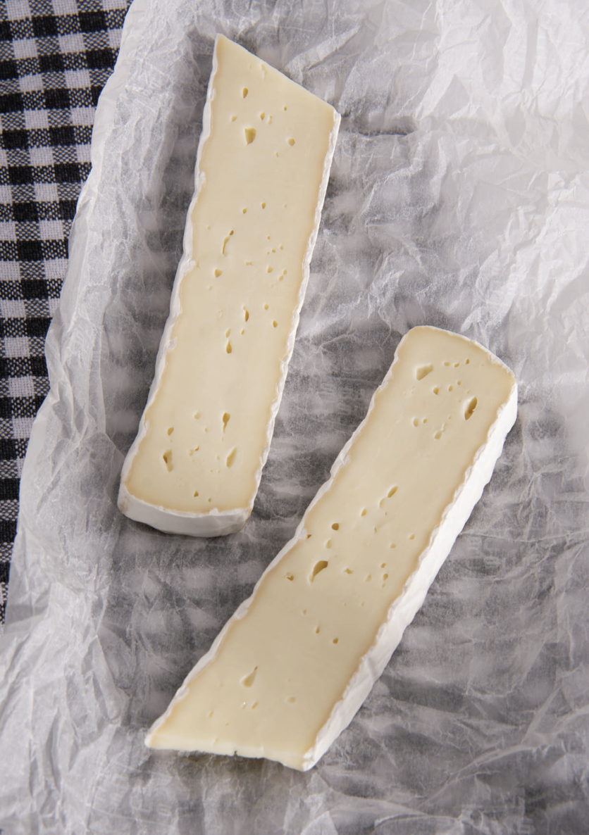 - Камамбер: Небольшой круг диаметром примерно 11 см и весом 250–300 г. Корочка у него более выраженная и плотная, а внутренняя часть со временем становится кремообразной.