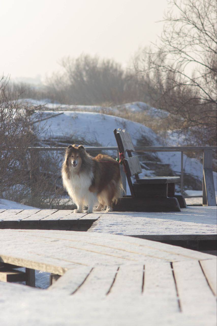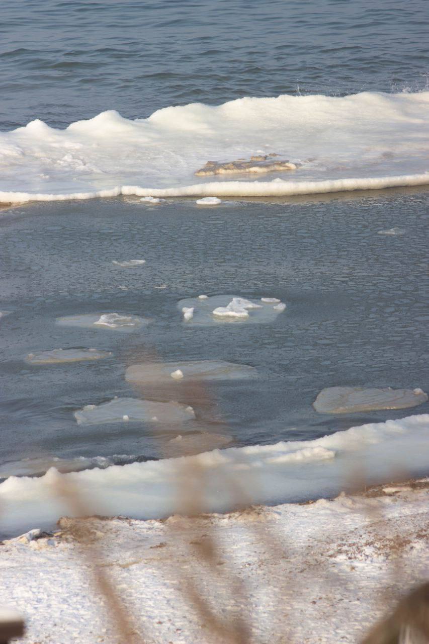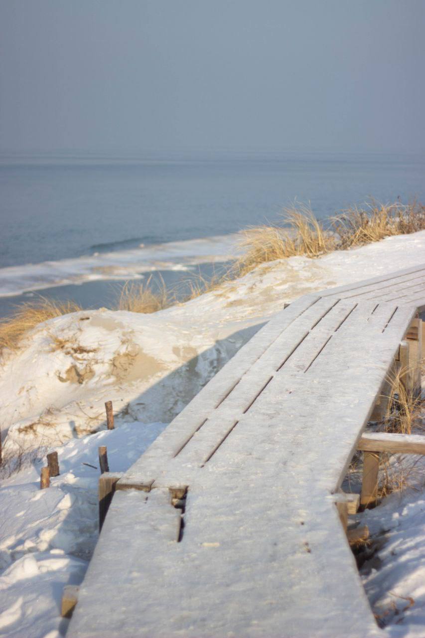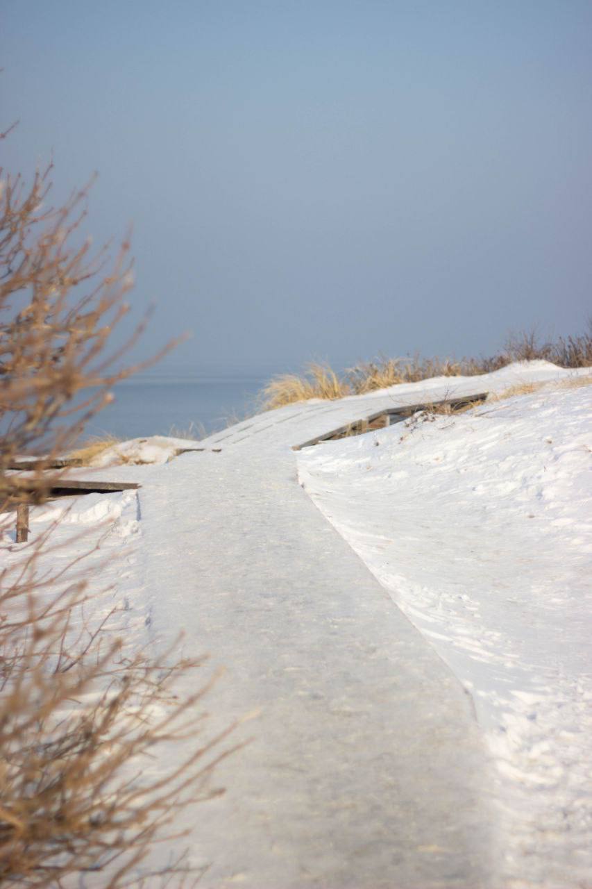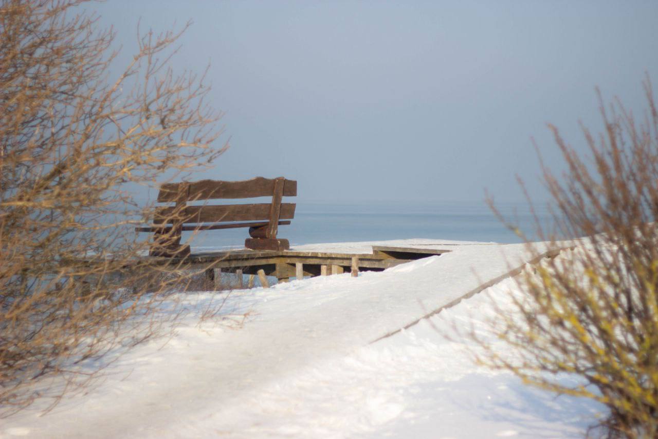 Белый пушистый снег идеально сочетается с песочным цветом пожухлой растительности. Солнце ласково освещает прогулочные дорожки, пляж и плавающие в море льдины, а лёгкая дымка скрывает линию горизонта. Красота!