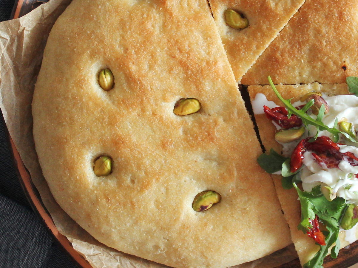 Дать тесту подойти, затем раскатать в лепёшку толщиной около 2 см и сделать углубления для фисташек, смазать ароматным маслом. Выпекать при 200–220°C до румяной корочки, ориентируясь на запах. Подача — сразу с страчателлой, томатами и зеленью, с посыпкой из поджаренных фисташок и ещё каплей масла.