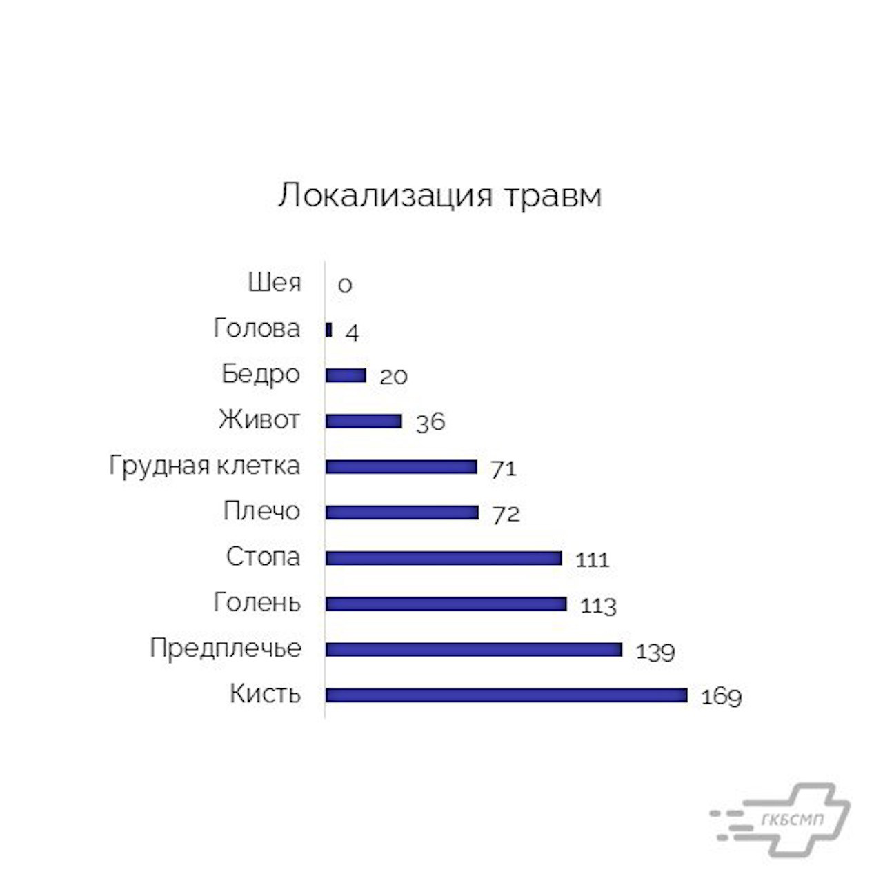 Наиболее распространенными повреждениями оказались травмы рук: предплечье и кисти.