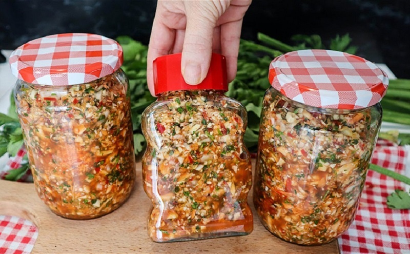 Всё режут крупно, затем измельчают в чаше до крупной крошки, соединяют с зеленью и чесноком, ещё раз перемешивают и утрамбовывают по банкам. Банки закрывают крышками и прячут в тёмном прохладном месте. Так вкус сохраняется дольше, а соль предотвращает порчу.