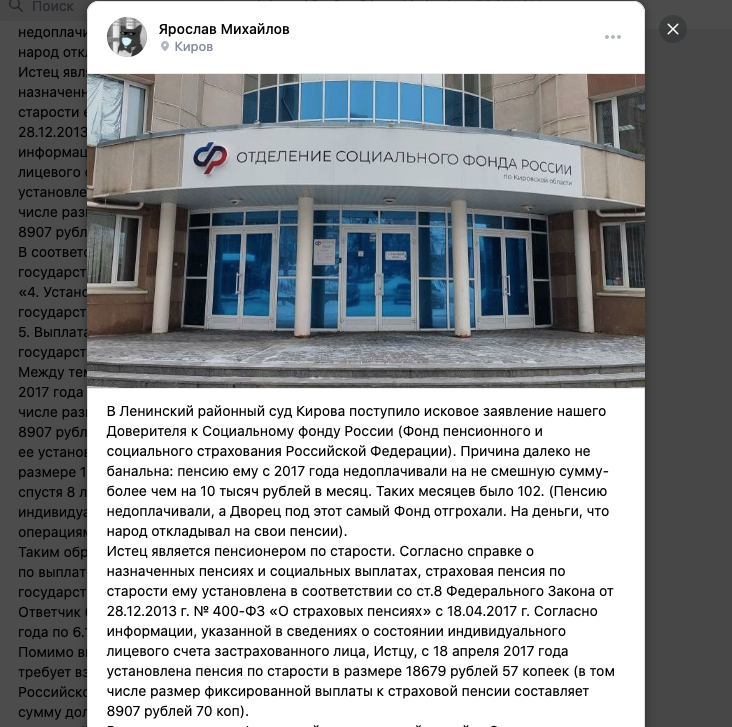 В Кирове подан иск к Социальному фонду России, согласно которому пенсионерка недополучила более 1 миллиона рублей в течение восьми лет. История началась в 2017 году, когда Доверитель, вышедшая на пенсию в 2012 году, получила уведомление о повышении размера своей пенсии, установленного на уровне 18679 рублей 57 копеек. Однако, эта информация так и не дошла до пенсионерки, в результате чего она ежемесячно получала на 10 тысяч рублей меньше.