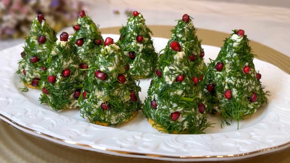 Отрезаем укроп, и берём часть готовой начинки, формируем конус и прокатываем его по укропу. Укладываем «ёлочки» на крекеры или печенье для подачи.