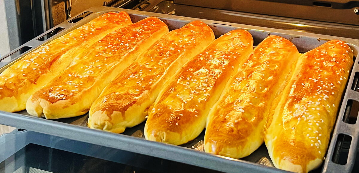 После того, как тесто подошло, разделить его на 6 равных частей. Каждую часть раскатать в тонкий овальный пласт, выложить начинку по середине и аккуратно завернуть края. Заготовки перенести на заранее смазанный растительным маслом противень, сверху смазать желтком и посыпать кунжутом.