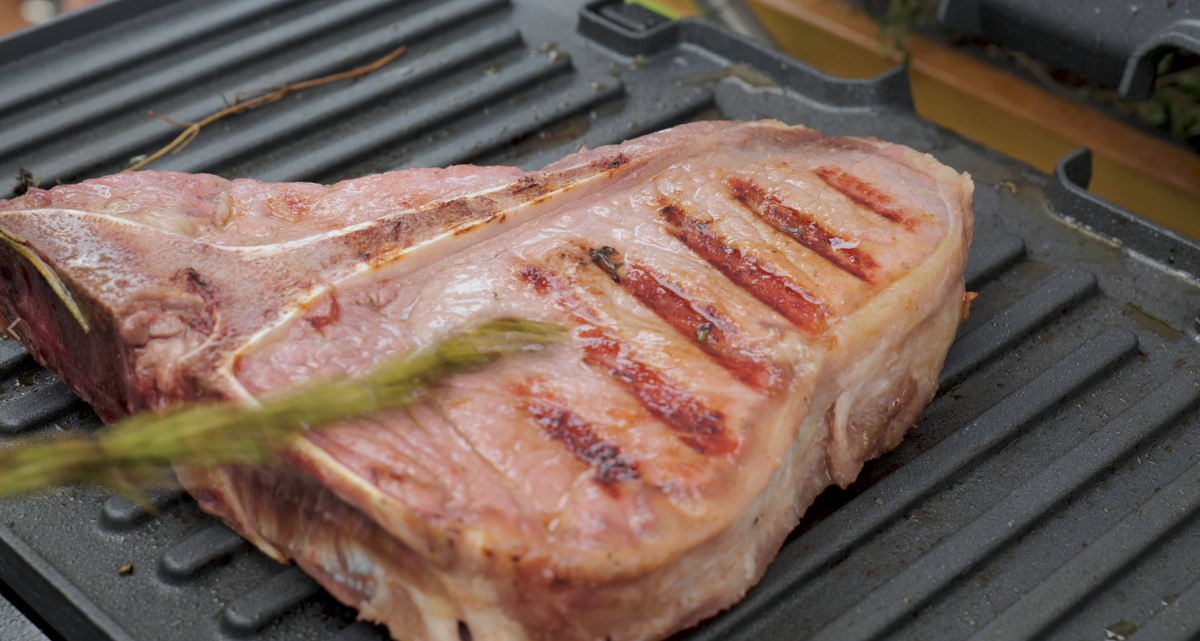 - Сначала создайте корочку, разместив стейк на решетке под углом 45° и повернув через 1-2 минуты для создания решетчатого узора.
