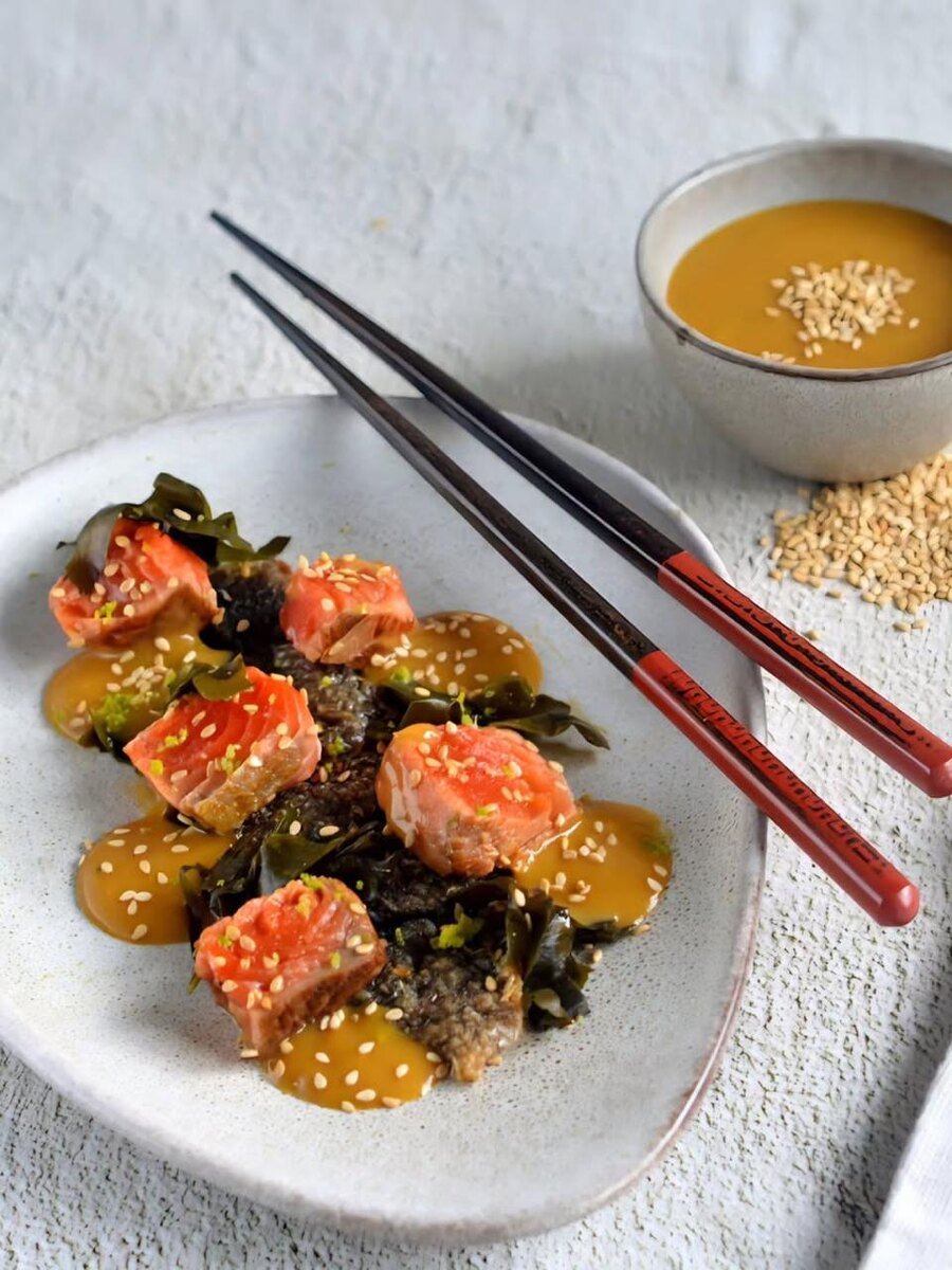 Никакое празднество не обойдется без оригинальных угощений, и сегодня на повестке дня - уникальное блюдо, сочетающее в себе пикантные нотки и свежесть. Приготовьте лосось с хрустящей кожей, манго и водорослями вакаме. Это не только зрелищно, но и невероятно вкусно!