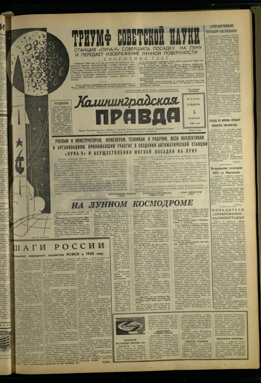 5 февраля 1966 года калининградцы узнали о том, что станция Луна-9 совершила мягкую посадку на поверхность Луны в районе океана Бурь (хотя всё произошло ещё вечером 3 февраля 1966 года).