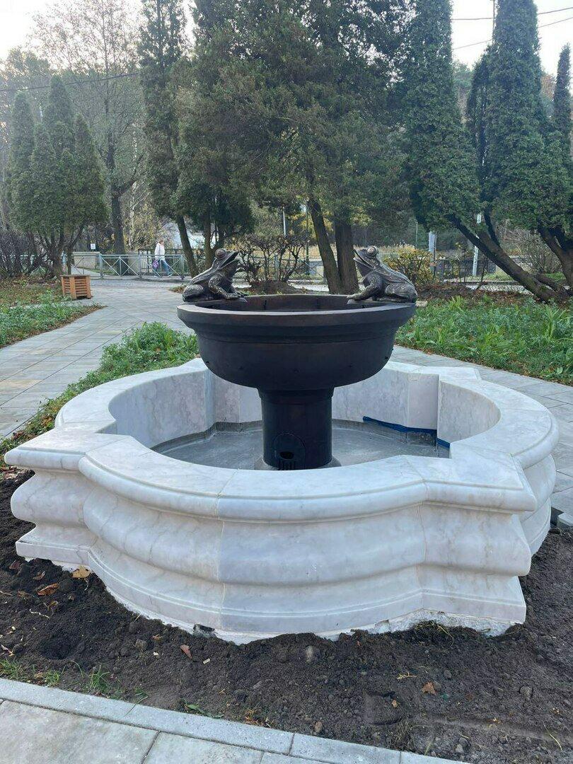 Два года назад в зелёной зоне установили фонтан с лягушками в ретростиле взамен утраченного довоенного. Теперь вокруг фонтана появятся дорожки из гранитной плитки, установят четыре скамейки с USB-зарядками.