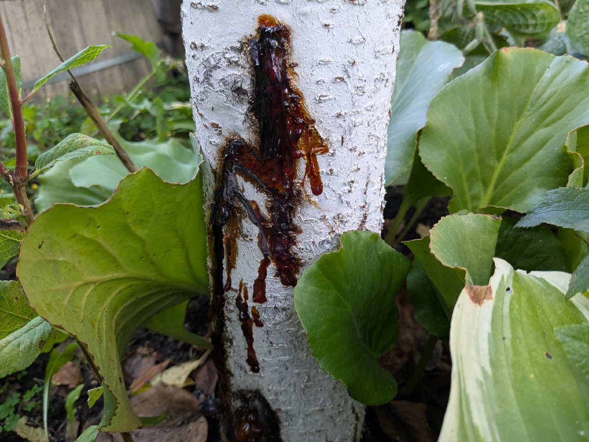 Камедь стекает по стволу сливы, обнаруженной у основания старого дерева, которое было убрано для создания парковки. Спустя год после спиливания на месте появилась новая слива, вырастающая из прикорневой поросли. За три года она расцвела и начала плодоносить, но визитные карточки плодов, кажется, могут оказаться под угрозой.