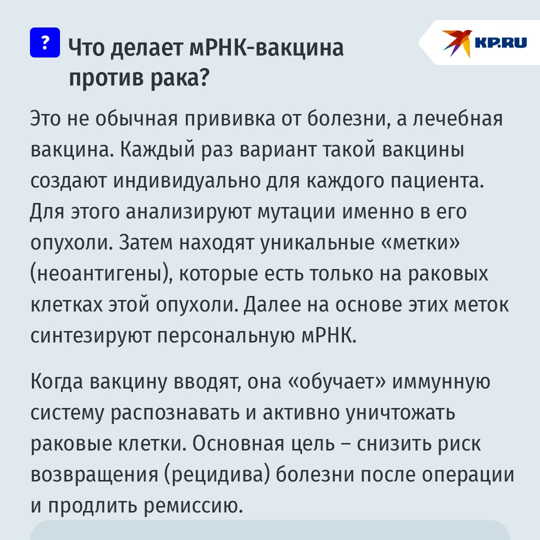 Речь идёт о мРНК-препарате под названием «Неовак-РОНЦ». Это не универсальная вакцина, а лекарство, которое создаётся индивидуально для каждого пациента. На первом этапе её будут применять для лечения меланомы — одного из самых опасных видов рака кожи.