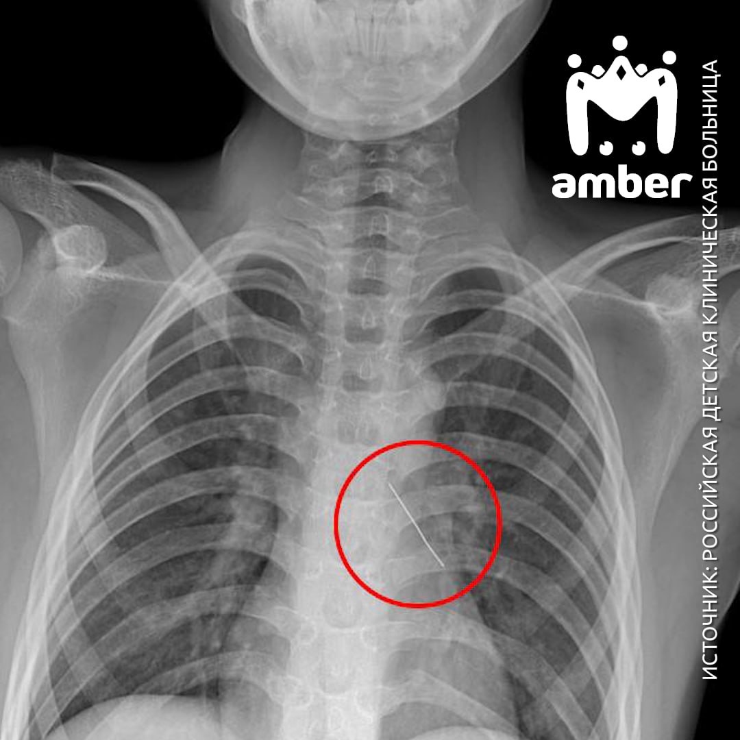 Сначала железку пытались извлечь в Калининграде — не вышло. Поэтому бортом санавиации паренька доставили в Москву. Он мог говорить только шёпотом, жаловался на сильные боли в груди. Рентген показал: булавка обосновалась в нижней доли левого бронха.