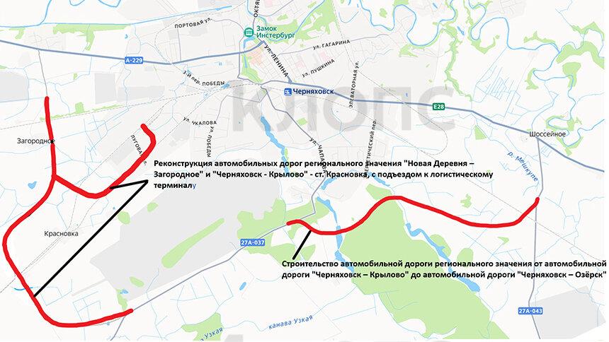 Дороги регионального значения пойдут в обход Черняховска и обеспечат подъезд к промышленной зоне и логистическому терминалу. Проект включает два этапа. Первый — реконструкция трасс Новая Деревня — Загородное и Черняховск — Крылово — ст. Красновка. Второй — строительство нового шоссе между дорогами Черняховск — Крылово и Черняховск — Озёрск.