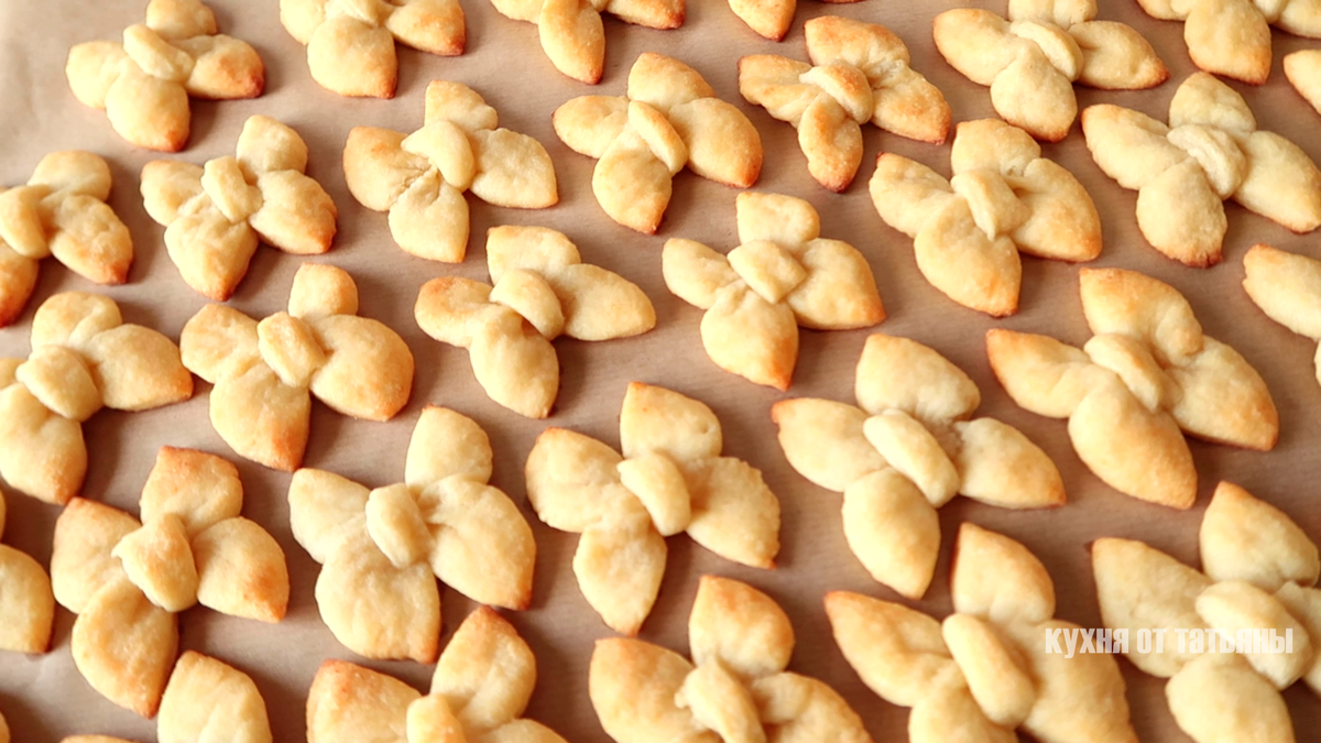 Выпечка готова через 12-15 минут. Печенье получается с золотистыми крылышками и приятным ароматом запеченного творога. Если нет времени на сложные формы, тесто можно просто нарезать на квадраты, что сократит время приготовления. Это печенье не только вкусное, но и радует глаз своим внешним видом.