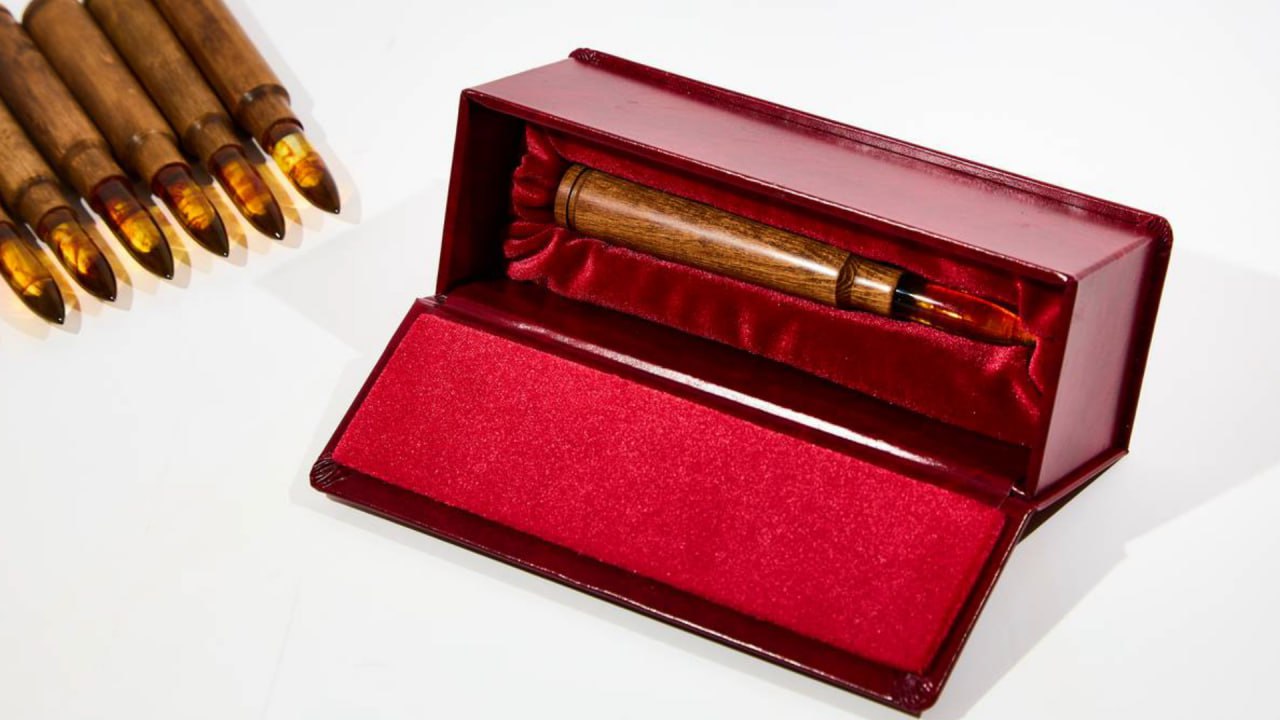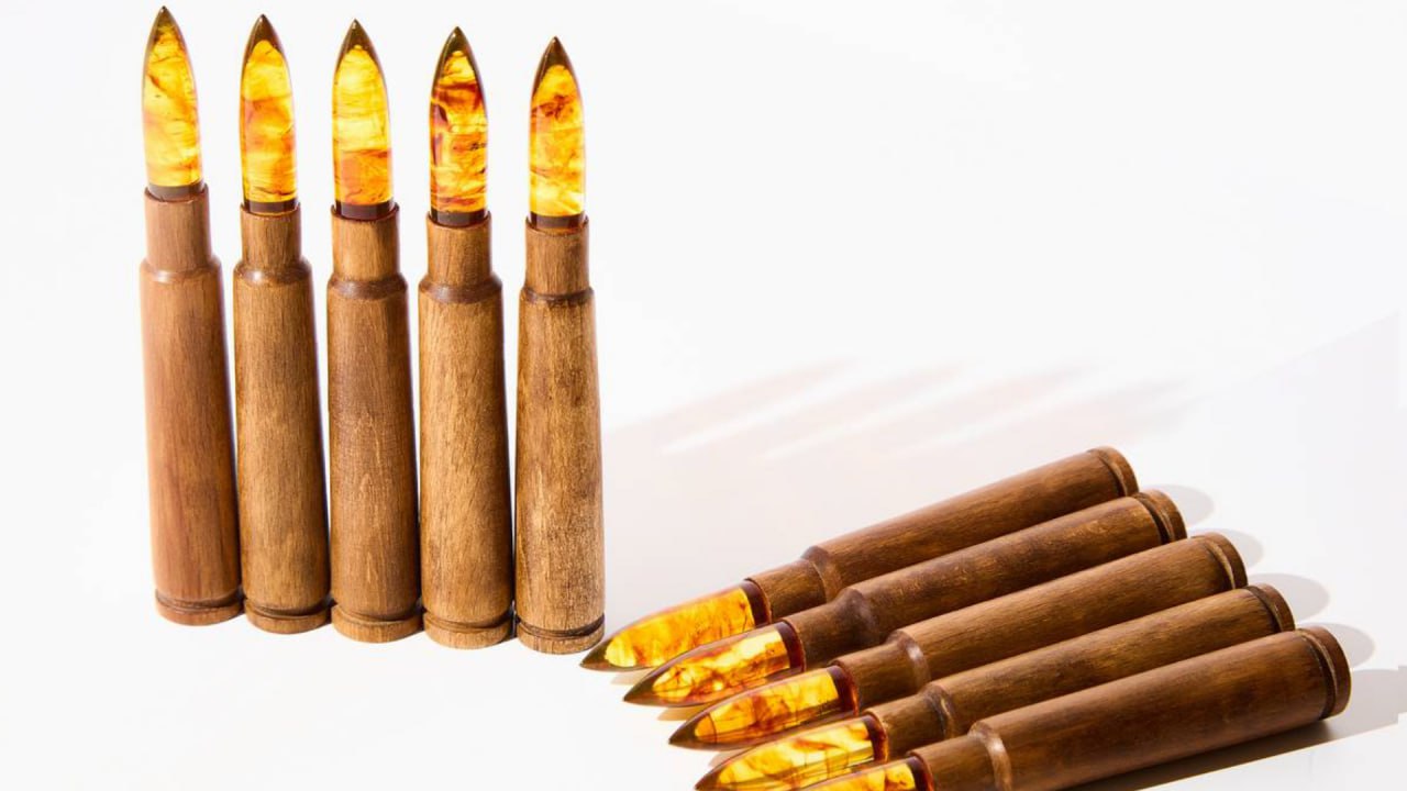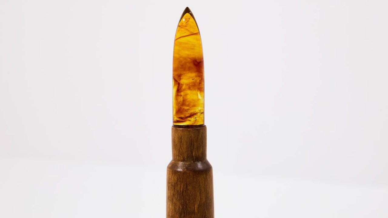 Гильза патрона выполнена из бука, а пуля — из солнечного камня. Янтарную деталь отличает нетипичный для балтийского самоцвета рисунок.