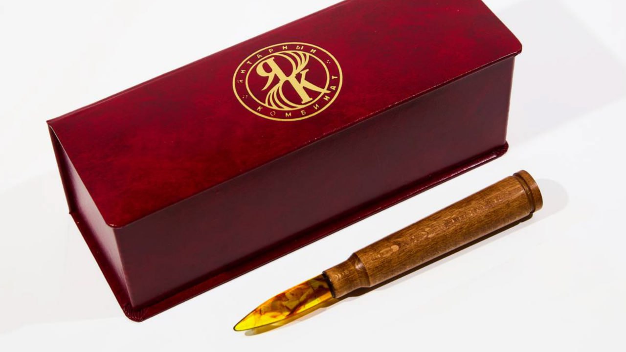 Сувенир в форме крупнокалиберного пулеметного патрона изготовил Калининградский янтарный комбинат, сообщила пресс-служба предприятия.